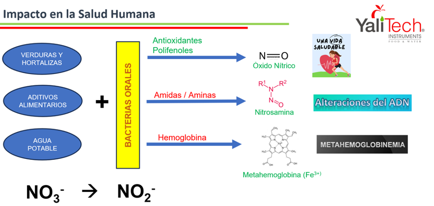 Por otro parte, si el Nitrato proviene de alimentos preservados, tales como cecinas o embutidos, el nitrato se transforma a Nitrito, el que puede reaccionar con aminas o amidas presentes en el alimento para formar compuestos Órgano-Nitrogenados, como la Nitrosamina, por ejemplo. Este tipo de compuestos son considerados cancerígenos.