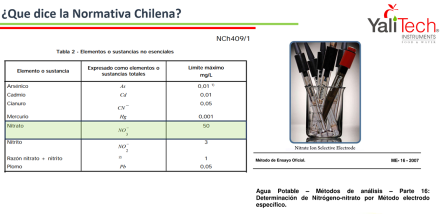 En Chile, al igual que la OMS, la Norma Chilena NCh 409/1 indica un límite máximo de 50 ppm de nitrato en el agua. Adicionalmente, la Superintendencia de Servicios Sanitarios SISS establece que la determinación de Nitratos en el agua se debe realizar mediante el método de análisis con Electrodo de Ion Específico (ISE).