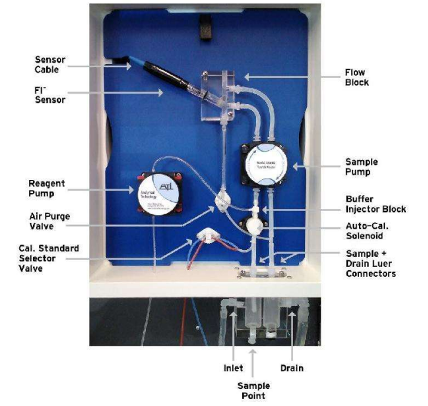 El Módulo Químico contiene una celda de flujo donde se inserta el electrodo. Opera con 2 pequeñas bombas peristálticas independientes. Con una de ellas el sistema toma muestra, ajusta la fuerza iónica con solución ISA y la hace circular a través de la celda donde se encuentra el electrodo.
