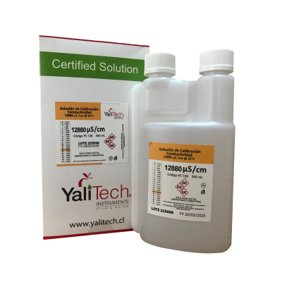 Solución de calibración de conductividad de 12880 μS/cm @ 25ºC respectivamente. Se suministran en botella de 500 mL (*), con certificado de análisis emitido por un laboratorio acreditado según ISO 17025. Al ser emitido este certificado por una tercera parte se garantiza de manera más objetiva la calidad de nuestra solución, entregando confianza a los usuarios.