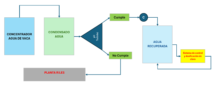 Un caso de éxito para YaliTech ha sido la implementación de la instrumentación y comando automático para la recuperación de un condensado de agua obtenido a partir de suero de leche (comúnmente denominado “Agua de vaca”). Este condensado normalmente se enviaba a la planta de Riles.